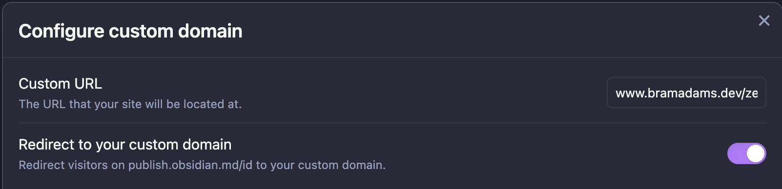 Obsidian Publish Custom Domain Settings: www.bramadams.dev/zettelkasten