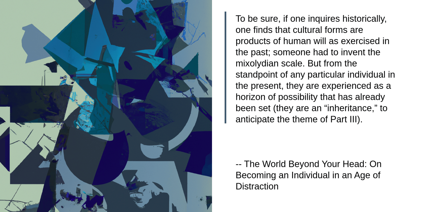 To be sure, if one inquires historically, one finds that cultural forms are products of human will as exercised in the past; someone had to invent the mixolydian scale. But from the standpoint of any particular individual in the present, they are experienced as a horizon of possibility that has already been set (they are an “inheritance,” to anticipate the theme of Part III).