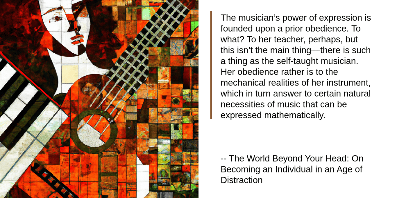The musician’s power of expression is founded upon a prior obedience. To what? To her teacher, perhaps, but this isn’t the main thing—there is such a thing as the self-taught musician. Her obedience rather is to the mechanical realities of her instrument, which in turn answer to certain natural necessities of music that can be expressed mathematically.