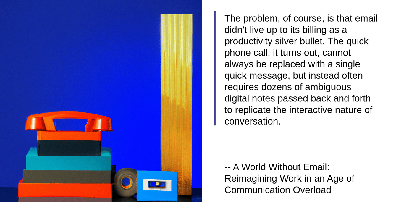 The problem, of course, is that email didn’t live up to its billing as a productivity silver bullet. The quick phone call, it turns out, cannot always be replaced with a single quick message, but instead often requires dozens of ambiguous digital notes passed back and forth to replicate the interactive nature of conversation.