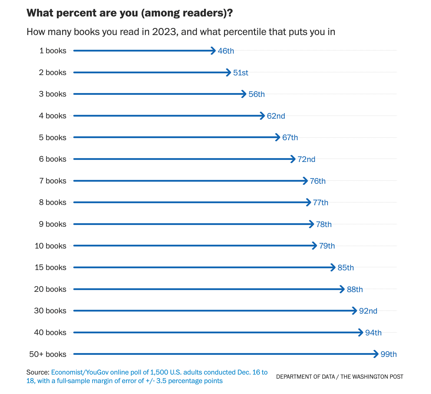 A few weeks ago, Andrew Van Dam of the Washington Post released a piece on how much Americans read in 2023. There are a few intriguing, disturbing, and hopeful ramifications & conclusions we can draw from this dataset.