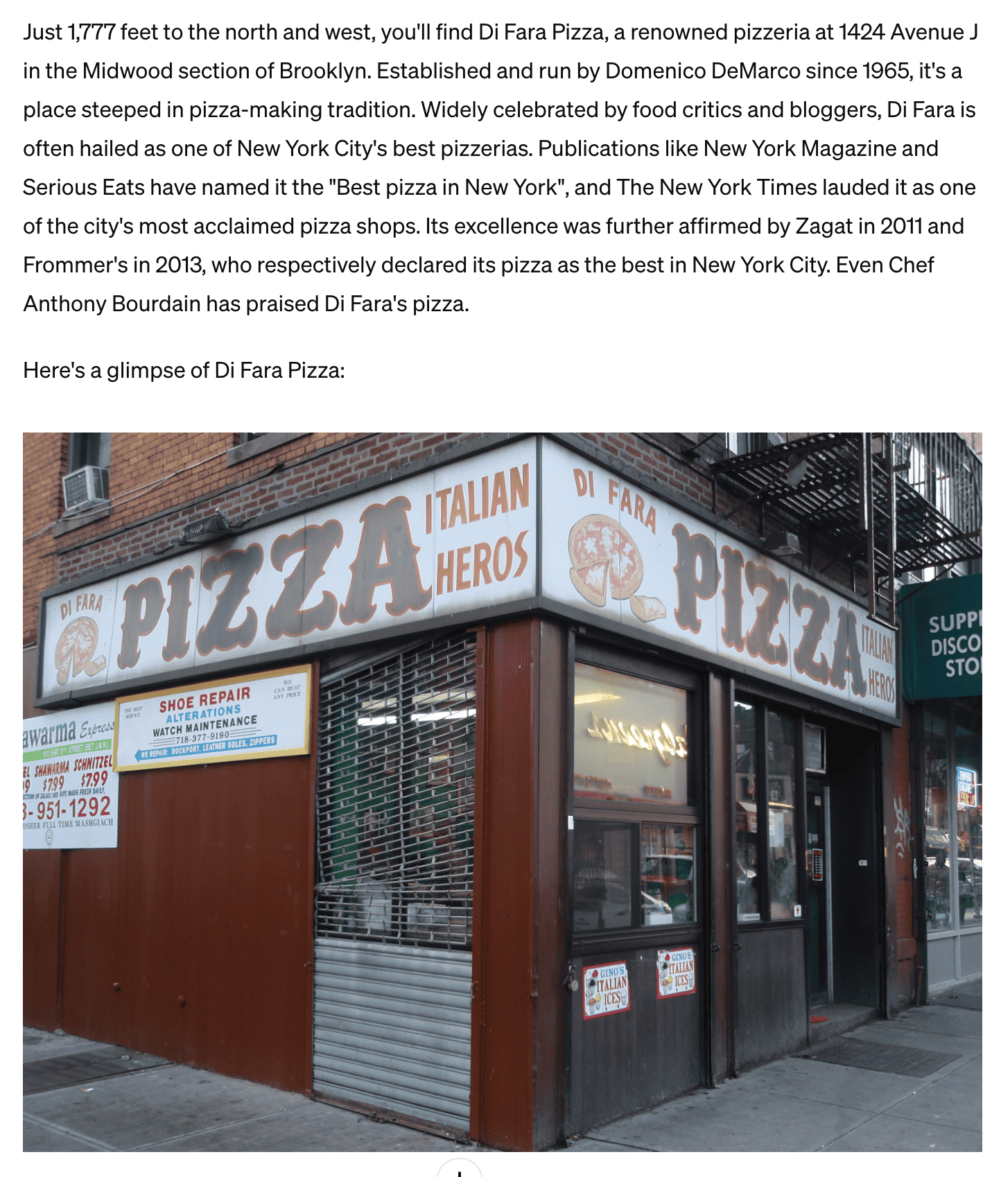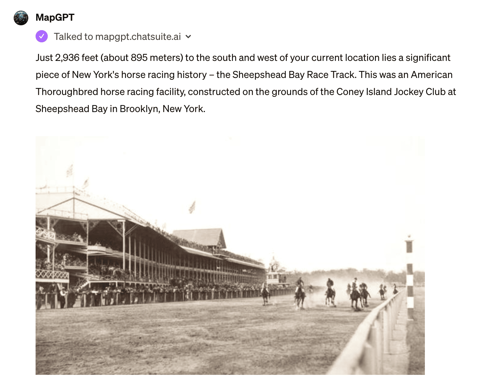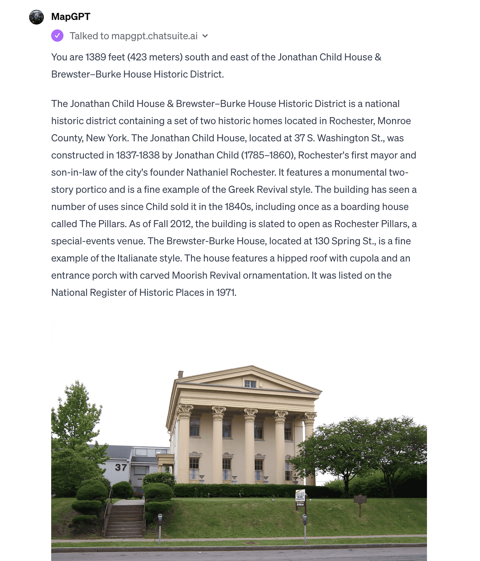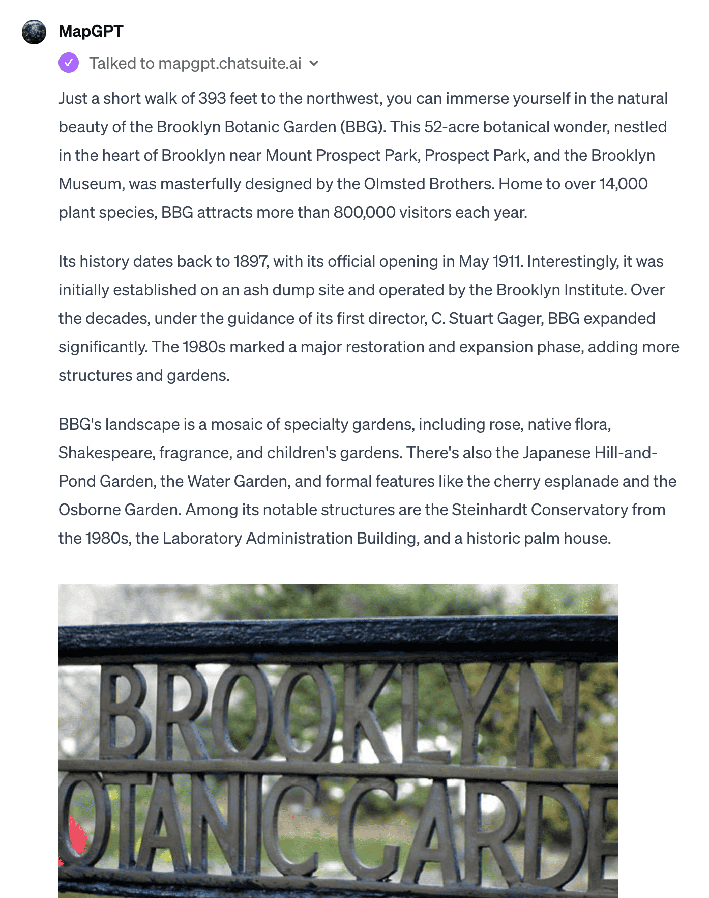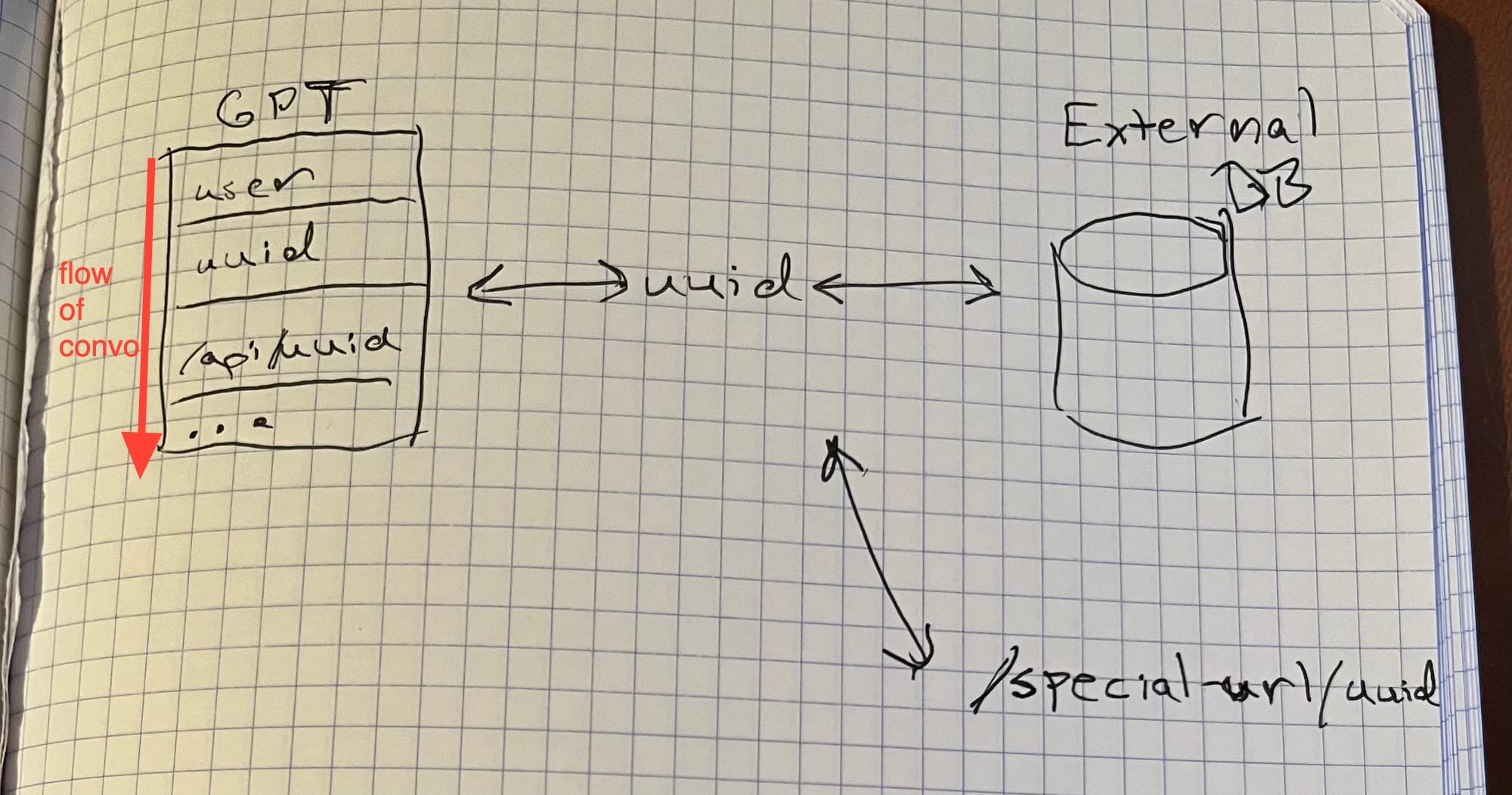 In the first action call above, we also assign users a random UUID. This UUID will follow them for the rest of the chat session. Incidentally, this gives a ChatGPT "state" as we use that ID on our server (and a Redis cache) to keep track of the data we need to feed the user. With conditional instructions, location data, and GPT summaries of Wikipedia pages taken up valuable token space, this UUID design pattern has proven itself immensely useful and I'm excited to use it in many of my GPTs going forward.