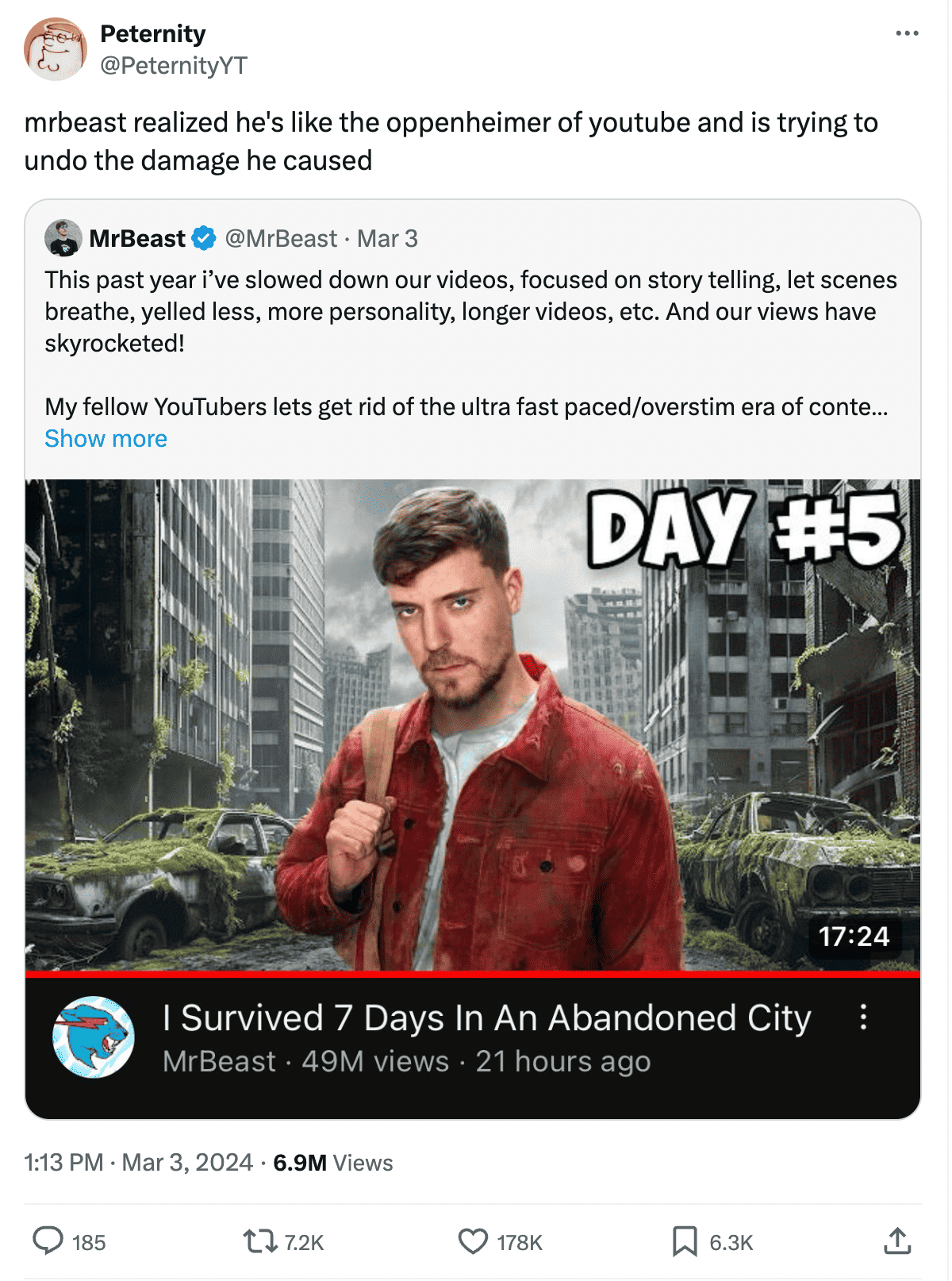 The success of Mr. Beast has caused many downstream effects, many clones, and in some weird coincidence, even more creators discussing the clones. The platform itself imposes its messaging, its voice, its ouvré onto those who live and create inside its borders.