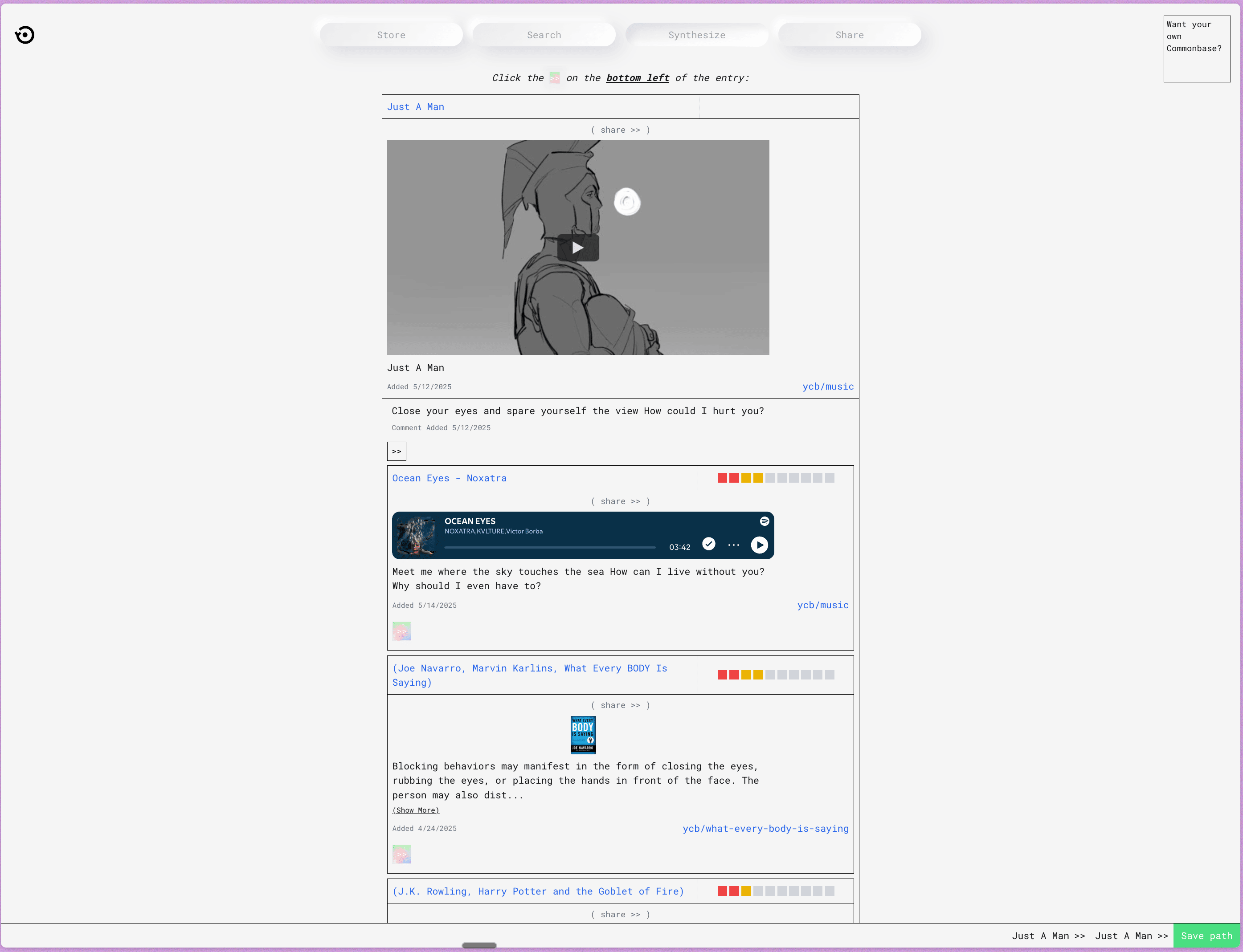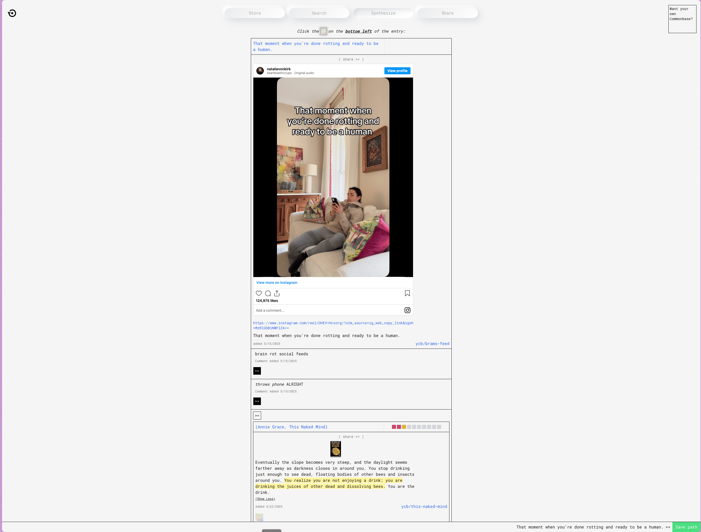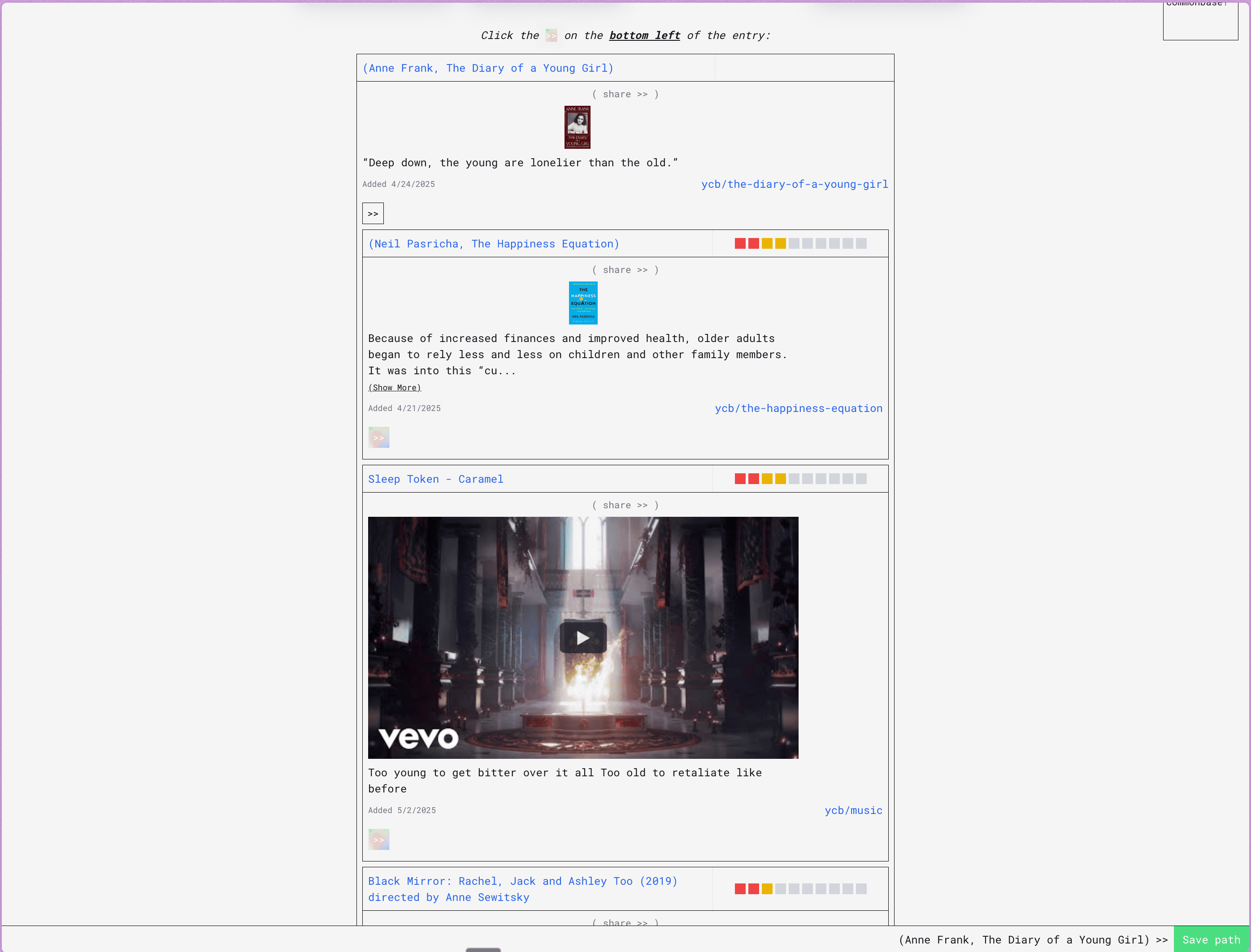 A variety of entries from Share Commonbase, paired with light commentary