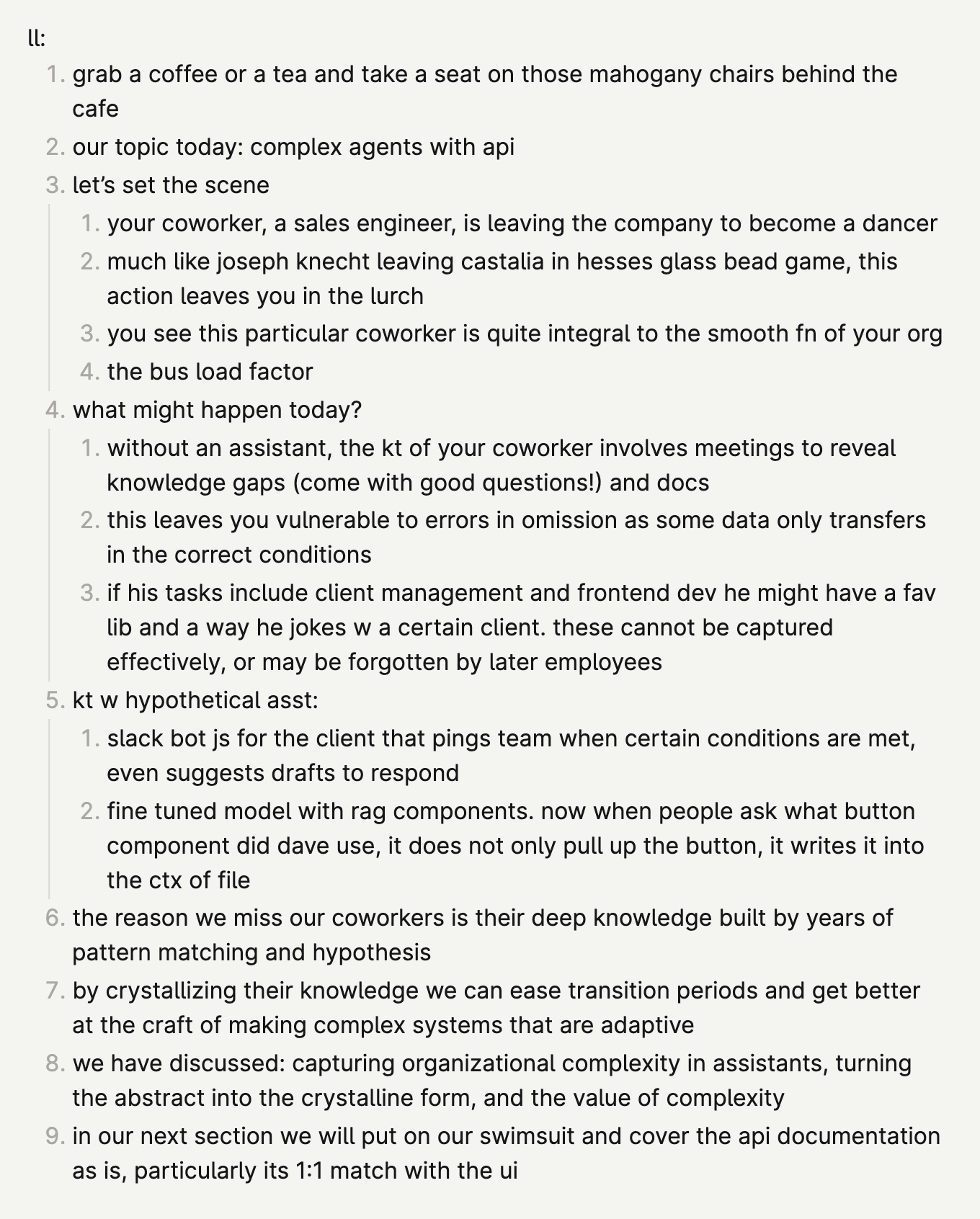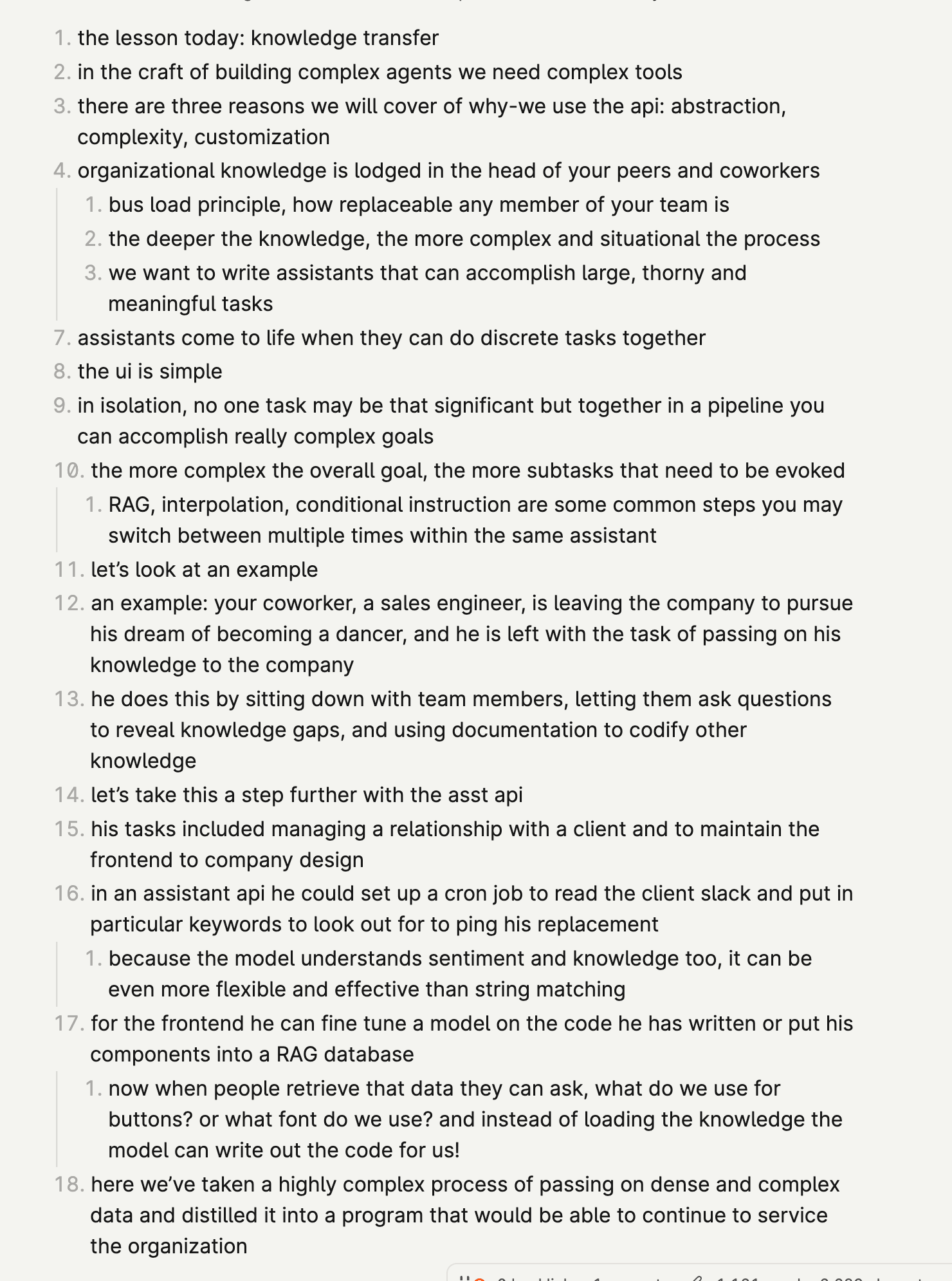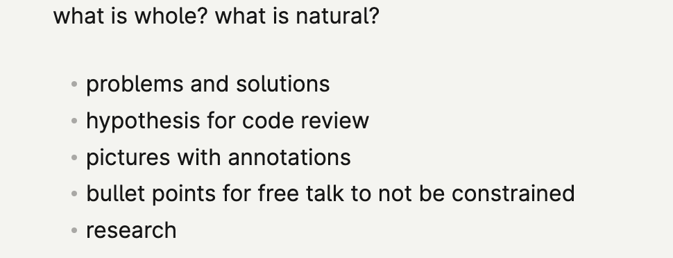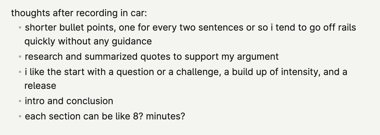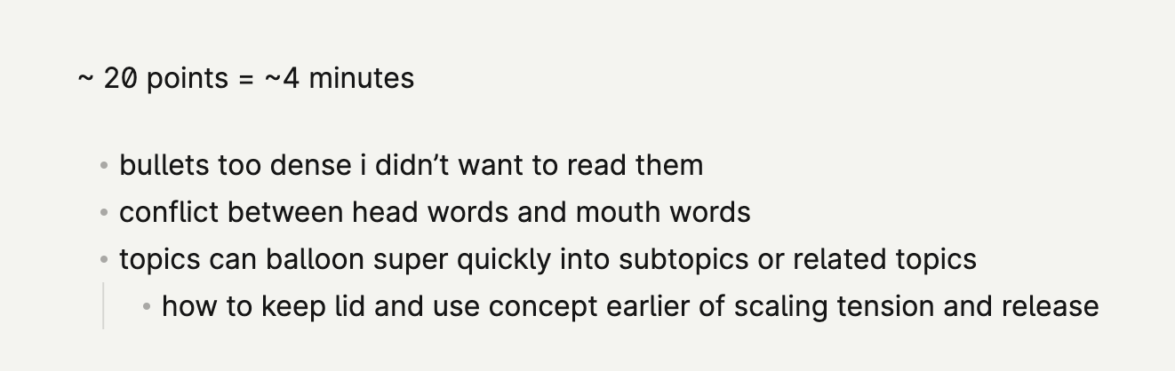 i started w super high level, wasn't dense enough and i flubbed a lot of words. i tried word for word, delivery was too boring/forced. i moved to bullets but detailed, but went too detailed, and they were hard to read. finally settled on bullets that aren't dense, but flow into each other so i'm never "winging it". hard balance to strike, still very wip