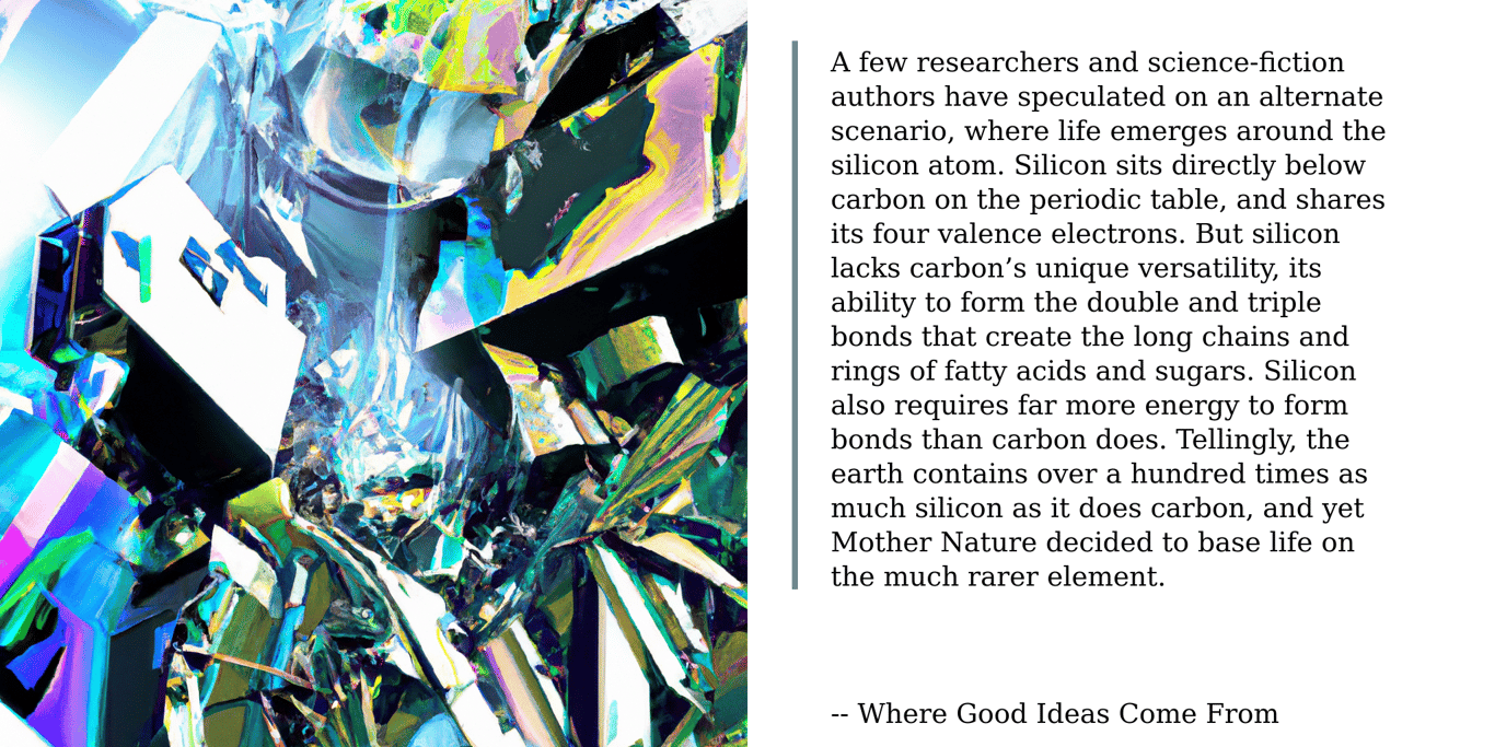 A few researchers and science-fiction authors have speculated on an alternate scenario, where life emerges around the silicon atom. Silicon sits directly below carbon on the periodic table, and shares its four valence electrons. But silicon lacks carbon’s unique versatility, its ability to form the double and triple bonds that create the long chains and rings of fatty acids and sugars. Silicon also requires far more energy to form bonds than carbon does. Tellingly, the earth contains over a hundred times as much silicon as it does carbon, and yet Mother Nature decided to base life on the much rarer element.