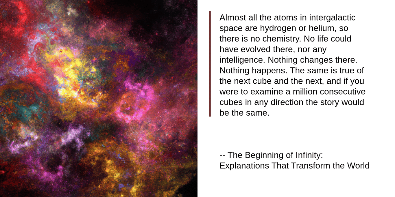 Almost all the atoms in intergalactic space are hydrogen or helium, so there is no chemistry. No life could have evolved there, nor any intelligence. Nothing changes there. Nothing happens. The same is true of the next cube and the next, and if you were to examine a million consecutive cubes in any direction the story would be the same.
