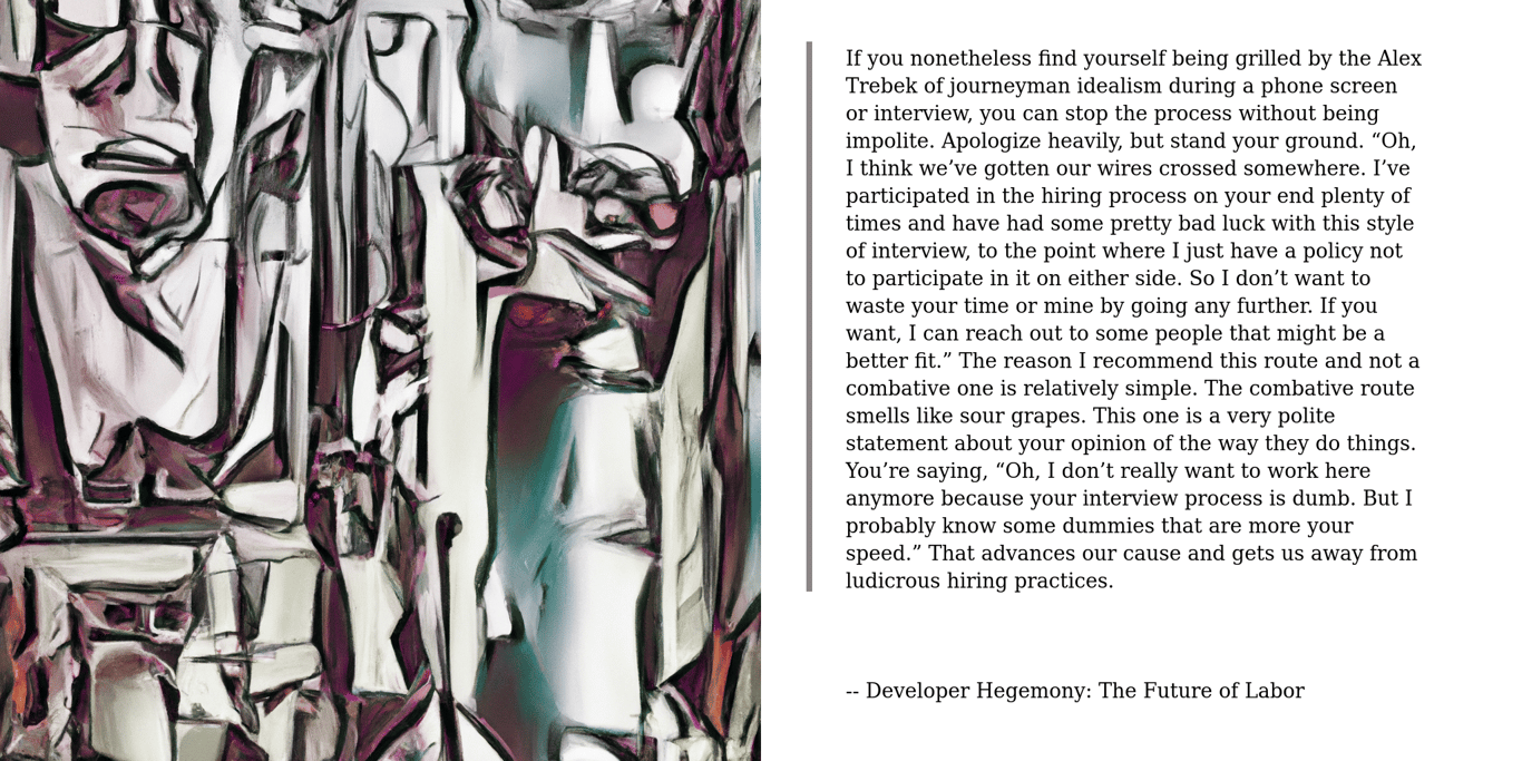 If you nonetheless find yourself being grilled by the Alex Trebek of journeyman idealism during a phone screen or interview, you can stop the process without being impolite. Apologize heavily, but stand your ground. “Oh, I think we’ve gotten our wires crossed somewhere. I’ve participated in the hiring process on your end plenty of times and have had some pretty bad luck with this style of interview, to the point where I just have a policy not to participate in it on either side. So I don’t want to waste your time or mine by going any further. If you want, I can reach out to some people that might be a better fit.” The reason I recommend this route and not a combative one is relatively simple. The combative route smells like sour grapes. This one is a very polite statement about your opinion of the way they do things. You’re saying, “Oh, I don’t really want to work here anymore because your interview process is dumb. But I probably know some dummies that are more your speed.” That advances our cause and gets us away from ludicrous hiring practices.
