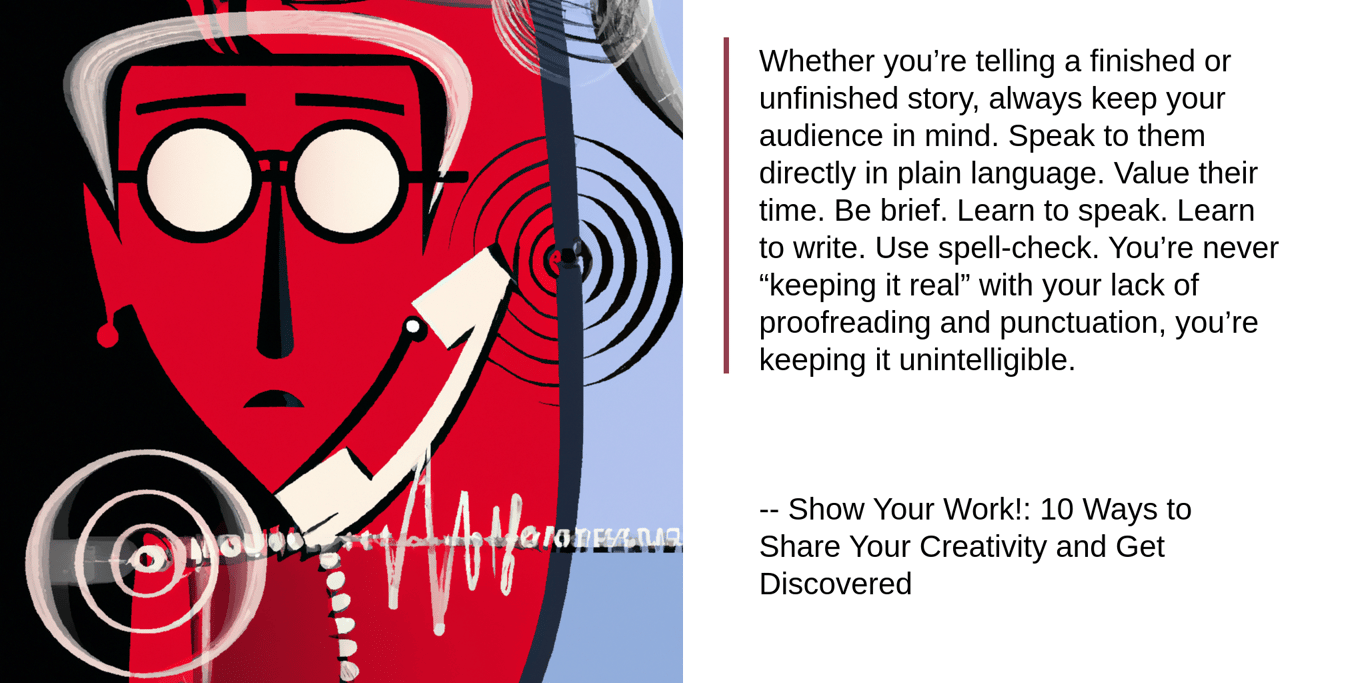 Whether you’re telling a finished or unfinished story, always keep your audience in mind. Speak to them directly in plain language. Value their time. Be brief. Learn to speak. Learn to write. Use spell-check. You’re never “keeping it real” with your lack of proofreading and punctuation, you’re keeping it unintelligible.