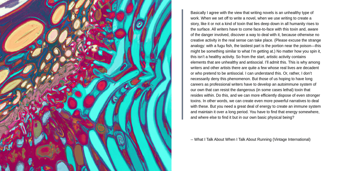 Basically I agree with the view that writing novels is an unhealthy type of work. When we set off to write a novel, when we use writing to create a story, like it or not a kind of toxin that lies deep down in all humanity rises to the surface. All writers have to come face-to-face with this toxin and, aware of the danger involved, discover a way to deal with it, because otherwise no creative activity in the real sense can take place. (Please excuse the strange analogy: with a fugu fish, the tastiest part is the portion near the poison—this might be something similar to what I’m getting at.) No matter how you spin it, this isn’t a healthy activity. So from the start, artistic activity contains elements that are unhealthy and antisocial. I’ll admit this. This is why among writers and other artists there are quite a few whose real lives are decadent or who pretend to be antisocial. I can understand this. Or, rather, I don’t necessarily deny this phenomenon. But those of us hoping to have long careers as professional writers have to develop an autoimmune system of our own that can resist the dangerous (in some cases lethal) toxin that resides within. Do this, and we can more efficiently dispose of even stronger toxins. In other words, we can create even more powerful narratives to deal with these. But you need a great deal of energy to create an immune system and maintain it over a long period. You have to find that energy somewhere, and where else to find it but in our own basic physical being?