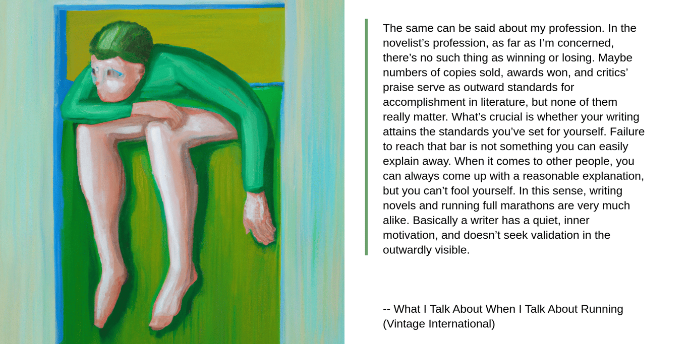 The same can be said about my profession. In the novelist’s profession, as far as I’m concerned, there’s no such thing as winning or losing. Maybe numbers of copies sold, awards won, and critics’ praise serve as outward standards for accomplishment in literature, but none of them really matter. What’s crucial is whether your writing attains the standards you’ve set for yourself. Failure to reach that bar is not something you can easily explain away. When it comes to other people, you can always come up with a reasonable explanation, but you can’t fool yourself. In this sense, writing novels and running full marathons are very much alike. Basically a writer has a quiet, inner motivation, and doesn’t seek validation in the outwardly visible.
