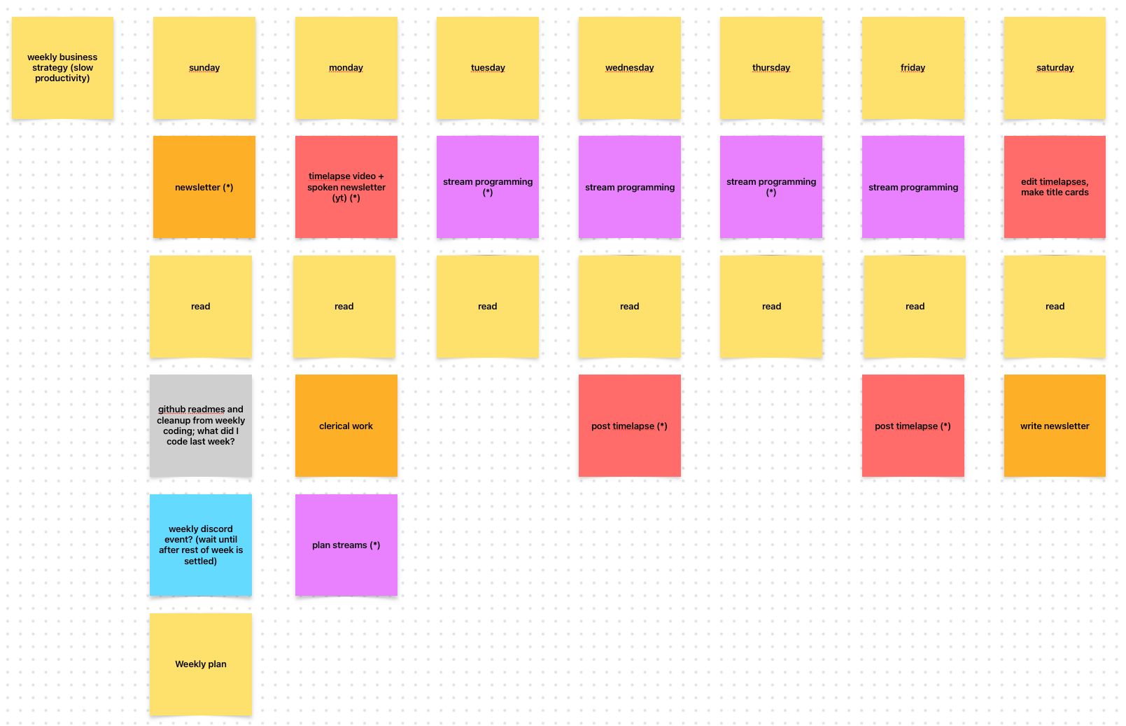 Here's how it breaks down roughly in terms of daily work, split by energy management, goals, and the "internal cooldown" of posting too often on social media: