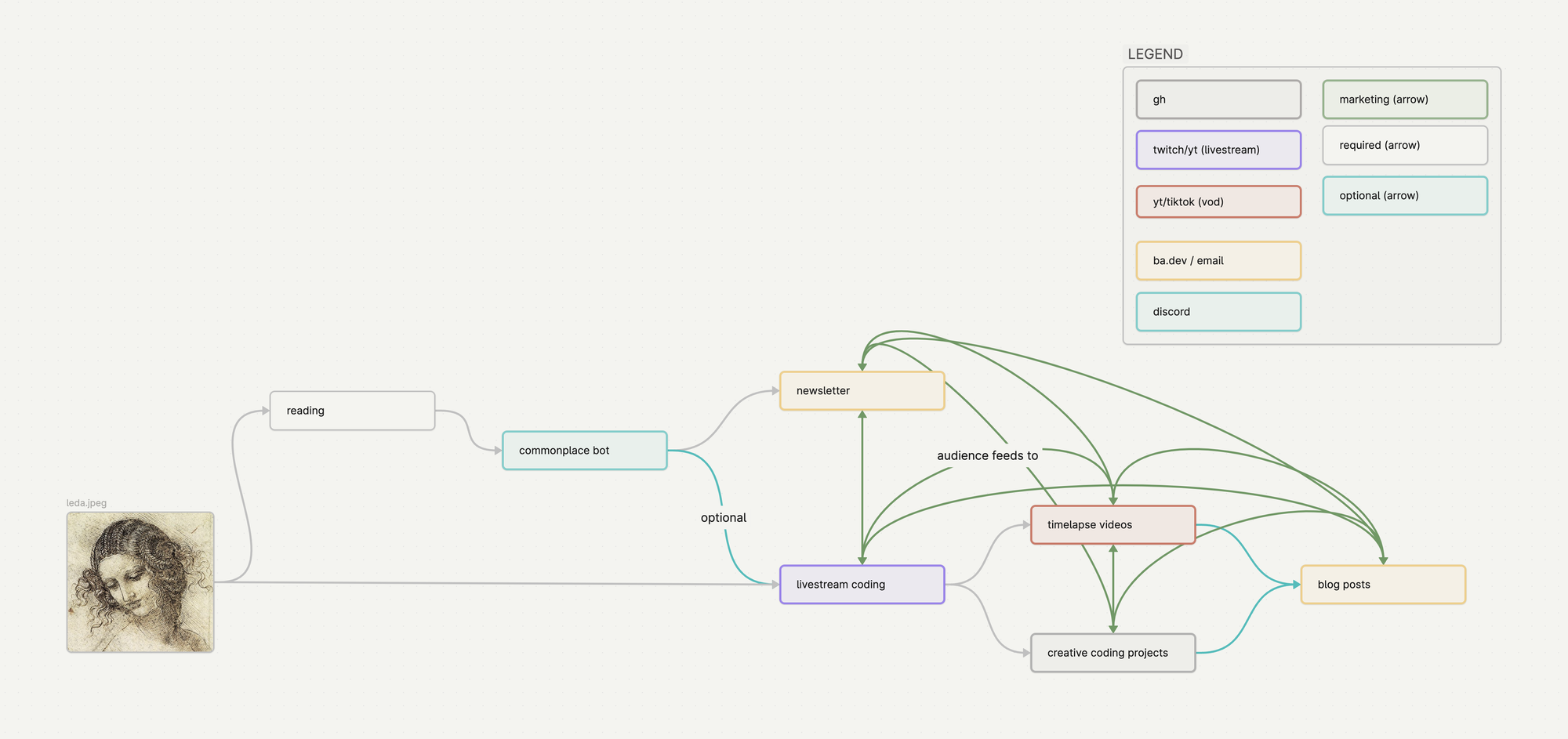 From the green arrows connecting all of the outputs on the ball of chaos on the right, that is all marketing. Of course, my penultimate "goal" for online creation as it were is to get people to sign up for my newsletter, as that is where I have the most potent and direct relationship with readers, but I also really like GitHub!