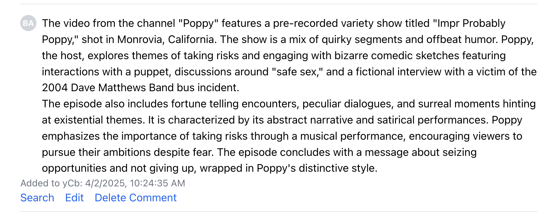 const openaiRes = await callOpenAI(openAIAPIKey, transcript[0].result.transcript, `You are a helpful assistant. You will be given a transcript of a video. Your task is to summarize the transcript in a concise and informative manner. Please ensure that the summary is accurate and relevant to the content of the video. Do not include any additional information or explanations. You are a glorified summarizer/teleprompter, so stay on topic. Use the channel name where appropriate, because it is the creators video. Channel name: ${transcript[0].result.channelName}`);